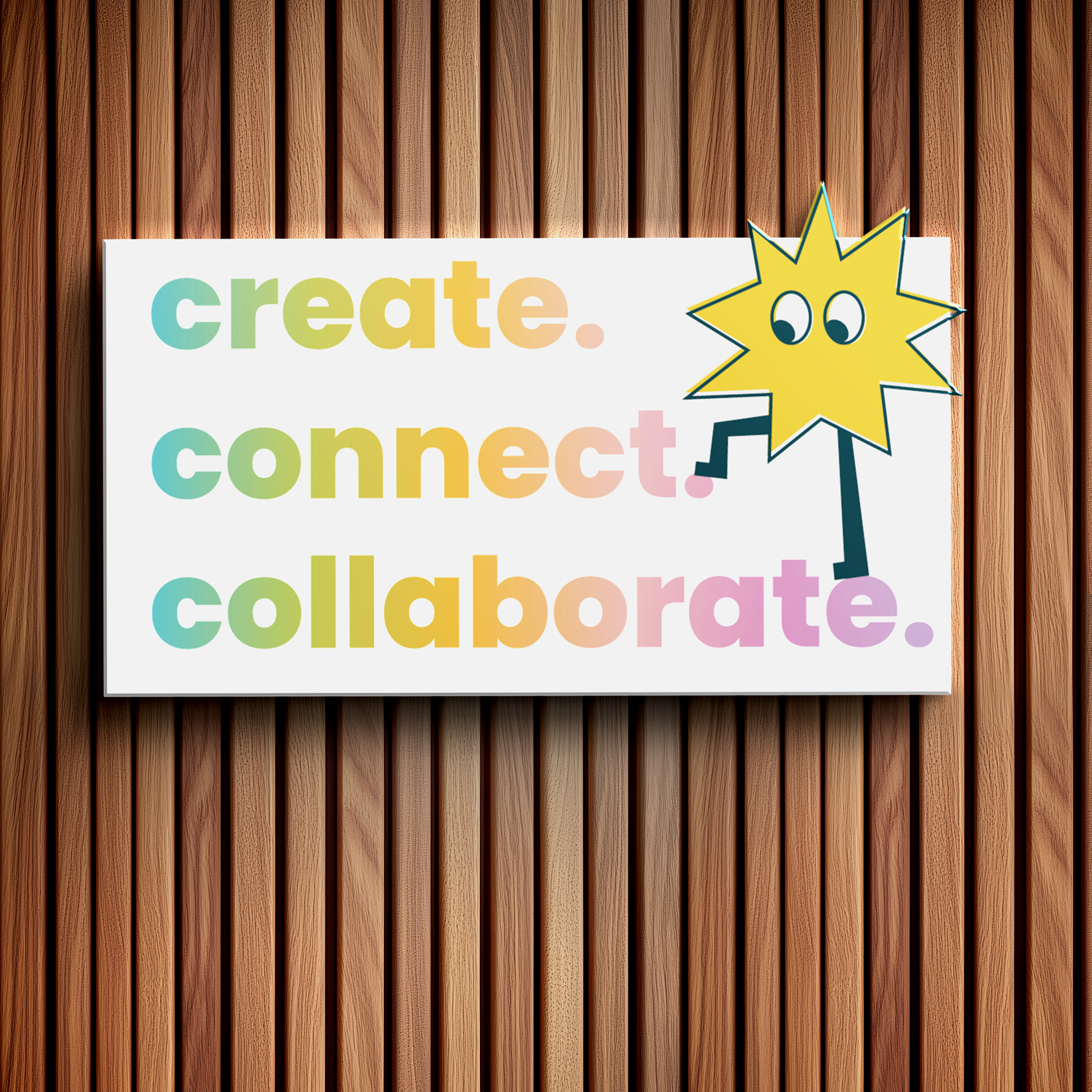 I used the brand’s gradient typography and friendly graphics to create an environment that feels creative and welcoming. The “Create. Connect. Collaborate.” piece reinforces the space’s mission, while the illustrated character adds a fun way to guide visitors through the building. Together, these elements help make the space feel engaging and easy to navigate.
